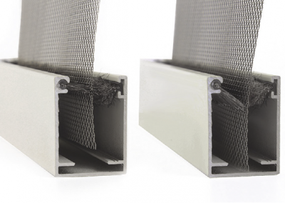 Le système de moustiquaires est composé d’une toile grise à maille offrant un degré d’ouverture idéal pour une visibilité optimale, tout en assurant une ventilation adéquate de la pièce.