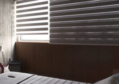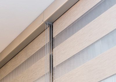 Le tissu Nuit et Jour présente des bandes horizontales qui intercalent un tissu transparent et un tissu semi-opaque et se superposent lorsqu’ils sont actionnés.