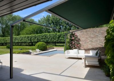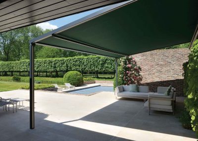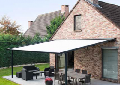 C’est la solution par excellence contre le soleil bas du matin au petit déjeuner ou le soir au coucher du soleil. Vous pouvez fermer complètement les côtés de la pergola avec des screens pour bloquer le vent. Les côtés sont joliment finis avec un tissu triangulaire fixe et des screens ZIP résistants au soleil et la pluie. Selon la nécessité d’évacuer l’eau, vous pouvez ajuster la hauteur de la pergola grâce à un poteau réglable (en option).