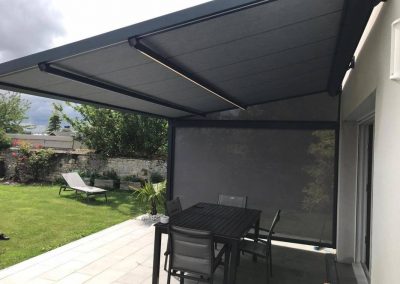 Grâce aux options d’éclairage d’ambiance, le soir venant, la terrasse devient un espace relaxant. Vous pouvez choisir un éclairage LED réglable dans les poteaux, les coulisses latérales et/ou la poutre de soutien. Un lambrequin entièrement automatique et enroulable, alimenté par l’énergie solaire, peut également être intégré.