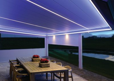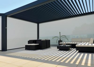 L’évacuation d’eau intégrée dans les poteaux et via un système de gouttière maintient votre terrasse sèche, en plus, des capteurs pratiques répondent automatiquement aux changements météorologiques. Nos pergolas peuvent être commandées via une télécommande, un smartphone ou une tablette, tout pour vous facilité d’utilisation!