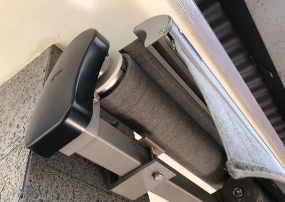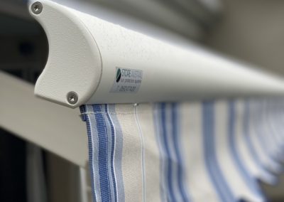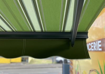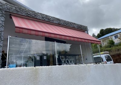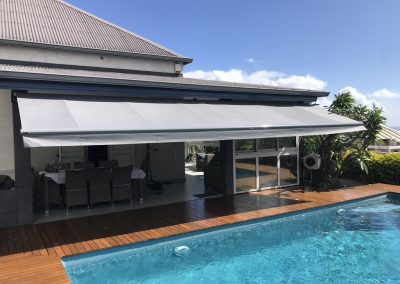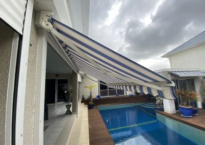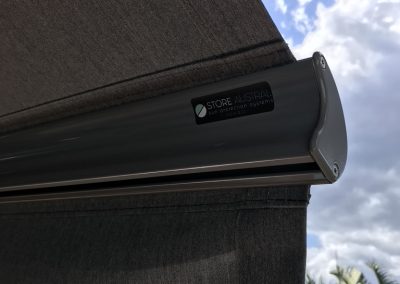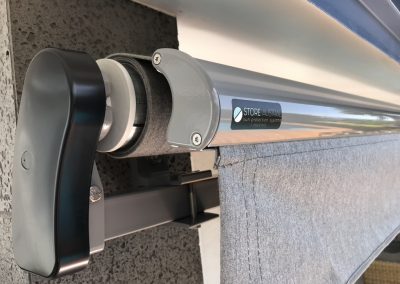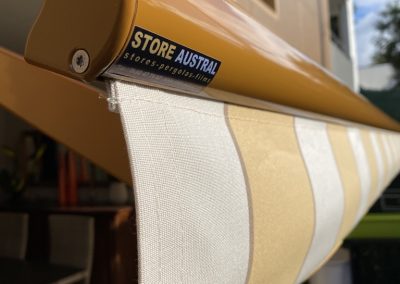 La commande du store peut etre manuel ou par motorisation Somfy avec télécommande.